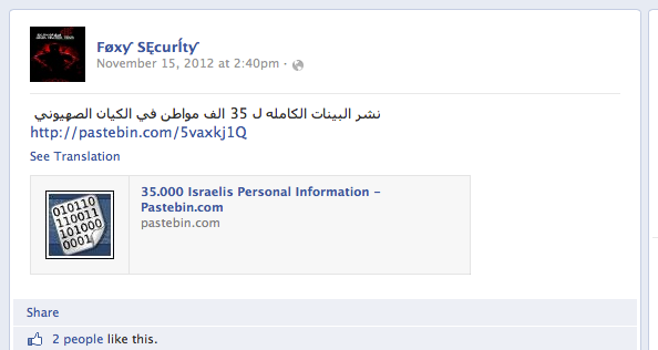Facebook post by Foxy Security announcing the release of personal details of 35,000 Israelis on 15 November 2012.