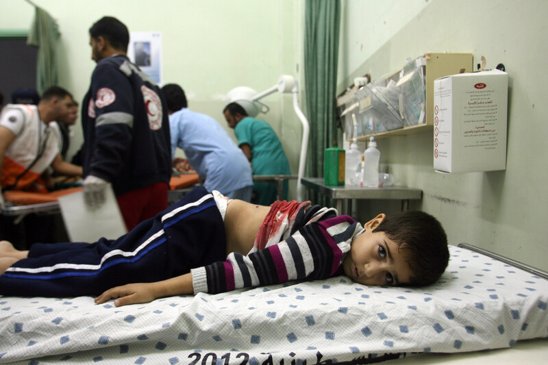 A wounded Palestinian boy at a hospital after an Israeli air strike in Khan Younis in the southern Gaza Strip on 15 November 2012.