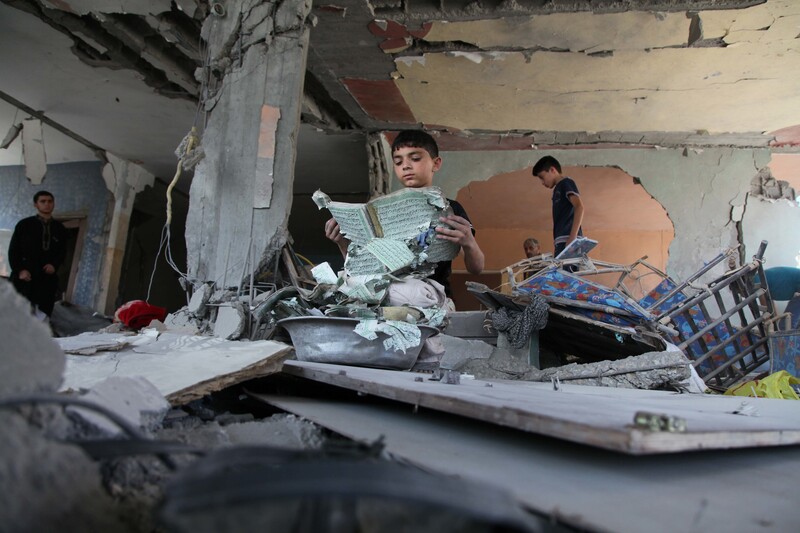After a five-hour ceasefire went into effect, Palestinians collect belongings in a Gaza City building damaged in an Israeli air strike, 17 July.