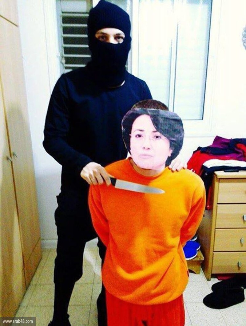 He is holding a knife at the neck of a person wearing a mask of the face of Haneen Zoabi, a Palestinian member of the Israeli parliament.