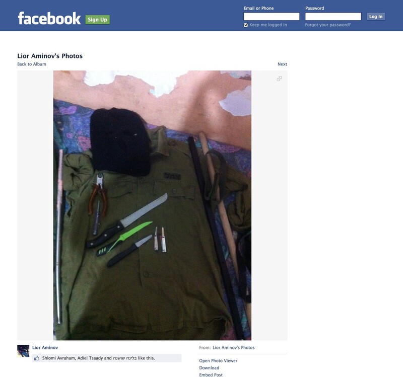 Facebook user Lior Aminov took part in a discussion with several other people apparently organizing to go and carry out vigilante attacks on Arabs. He posted this picture of an Israeli army uniform and weapons he intended to use against his victims.
