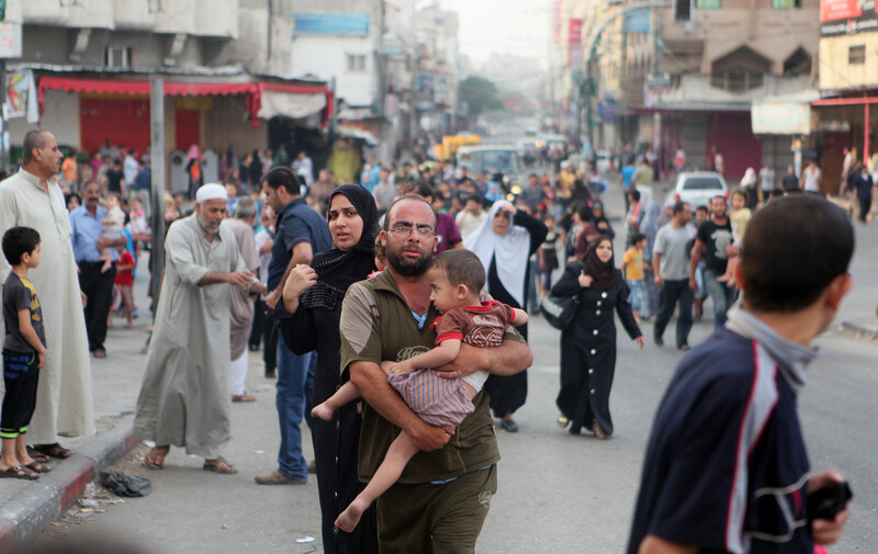 Palestinians flee the Shujaiya neighborhood of Gaza City during heavy Israeli shelling on 20 July.