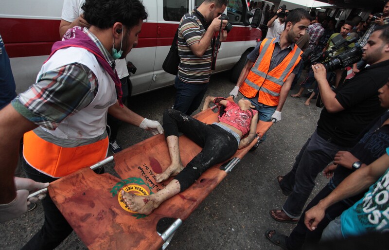 Palestinian medics carries the body of girl killed during Israeli shelling, outside al-Shifa hospital in Gaza City, 20 July.