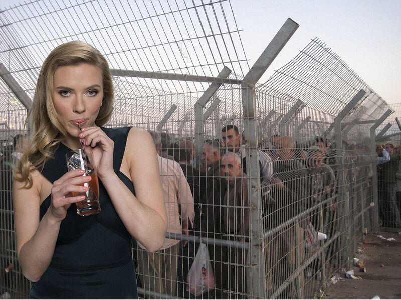 An artist’s collage juxtaposes the real-life conditions Palestinian workers face in the occupied West Bank with Scarlett Johansson’s role as SodaStream spokesmodel. (Collected online)