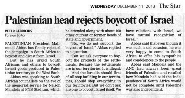 “No we do not support the boycott of Israel,” Mahmoud Abbas said at a press conference in South Africa, which he has been visiting to attend the Mandela memorial, The Star newspaper reported on 11 December.1