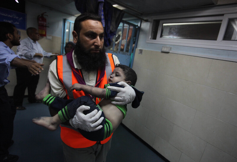 A Palestinian medic cares for a wounded child after a 19 August 2014 Israeli air strike on a house in Gaza City killed a young girl, a woman and injured 16 other people.