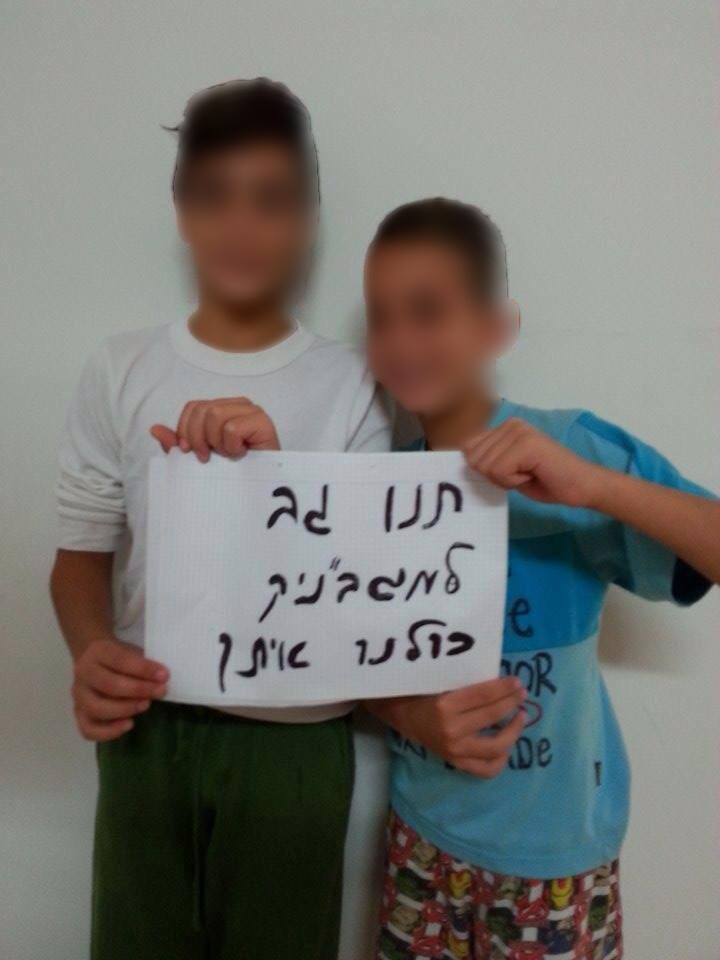 Image posted on Facebook shows Israeli children holding sign supporting occupation soldier accused of murdering seventeen-year-old Nadim Nuwara (faces blurred by The Electronic Intifada).