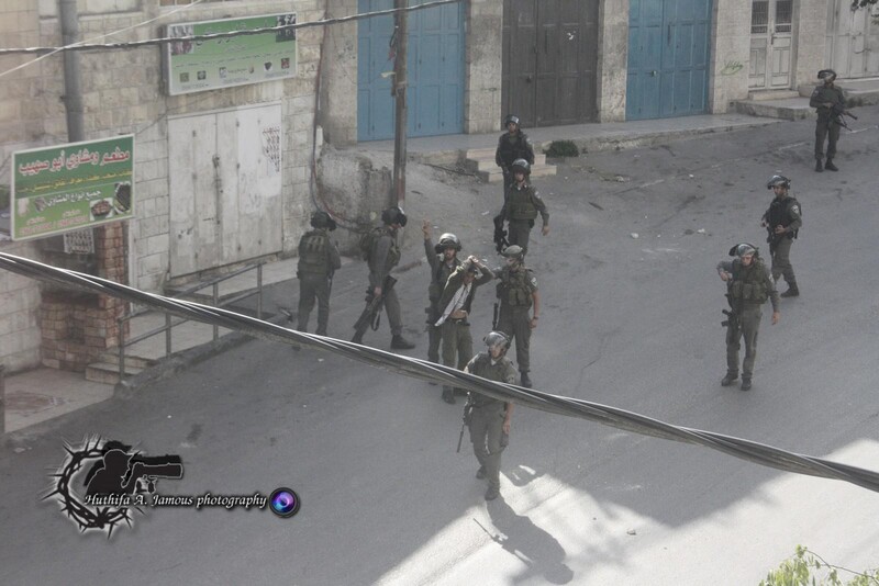 The youth appears to be handcuffed and his hands are held above his head by one of the occupation soldiers. As the soldiers force the teenager down the street, three of them raise their weapons and aim them, apparently at protestors who are outside the frame.