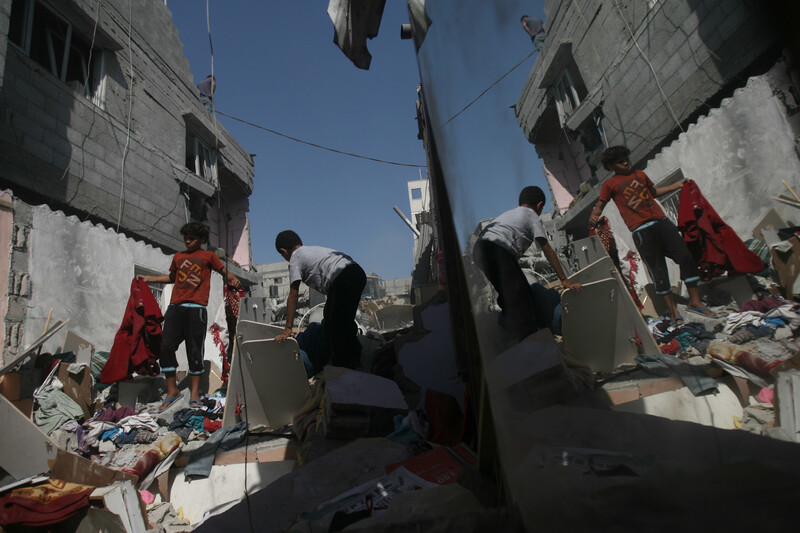 Children collect their belongings from a house destroyed by Israel in the Gaza city of Rafah this week.