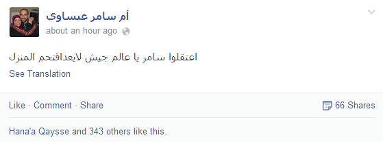 Minutes later his mother posted another Facebook status confirming the arrest. “World, they arrested Samer. The military in big numbers raided the house,” she wrote.