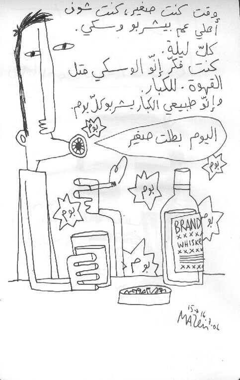 When I was young, I used to see my parents drink whiskey. All night long. I thought that whiskey is like coffee. For adults. And that it was normal that adults drink every day. … “Today, I am not young anymore.” … boom boom boom boom boom boom (Mazen Kerbaj)
