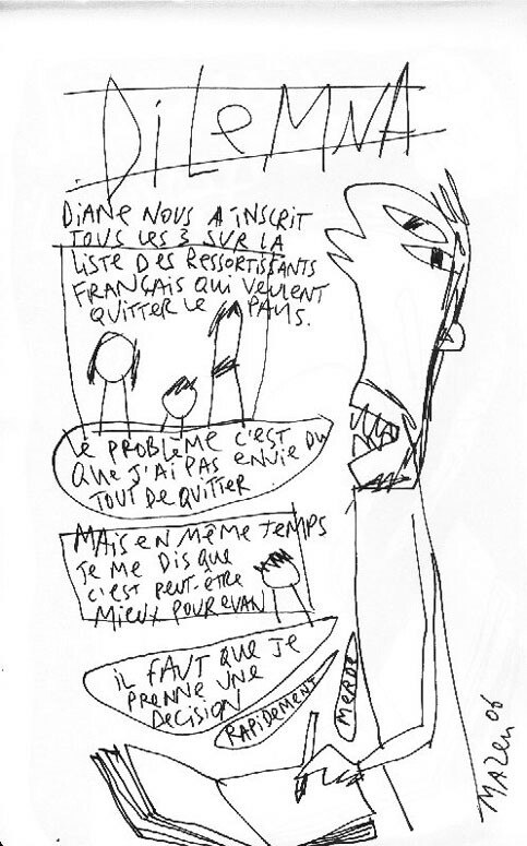 DILEMNA … Diane has registered us on the list of French citizens who wish to leave the country. … The problem is that I don’t feel like leaving at all. … But at the same time, it is maybe better for Evan. … I have to decide. … Quickly. (Mazen Kerbaj)