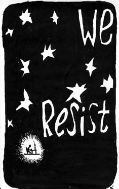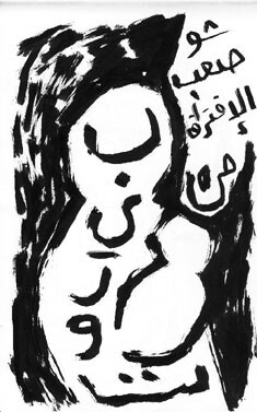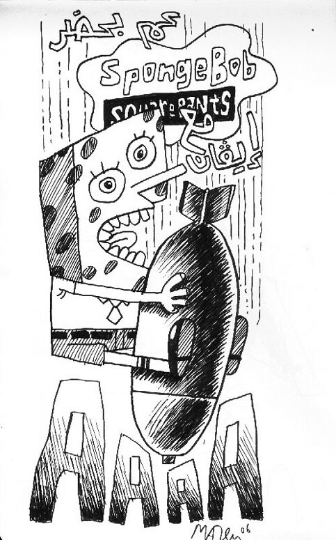 The following drawings are by Mazen Kerbaj, a Beiruti comic author, painter, and musician who was prompted to start his “Kerblog” after “two years of laziness” when Israel began to bomb his country and city. With the dark humor characteristic of his blog entries, he writes, “I’ll begin then by thanking Israel, who burned in one night two years of efforts to avoid getting myself trapped in this adventure. Good job guys! Especially the airport party. And the bridges. No way to leave the country. Nothing else to do than this blog” His entries onto Kerblog are a heady mix of despair, wit, and the determination to persevere.