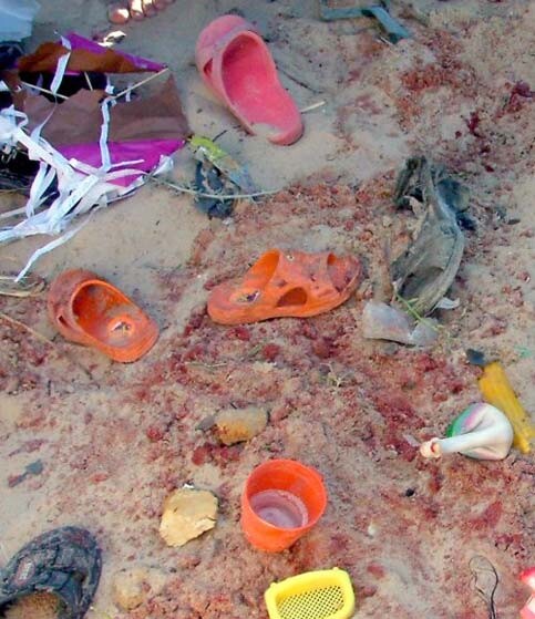 The white sand was turned into red mud where a tuft of little girl’s hair and pieces of flesh were covered with a kite.