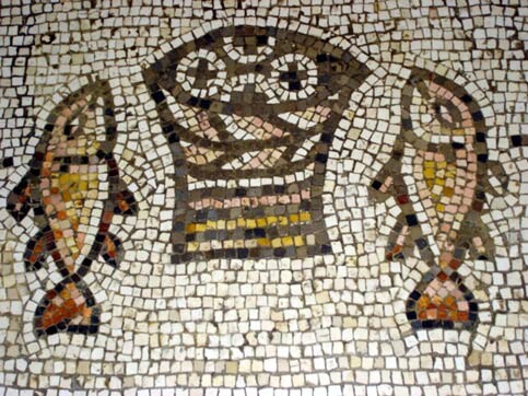 A famous ancient mosaic in the Church of the Loaves and Fishes on the sea of Galilee (taken by Christi Hoover Seidel)