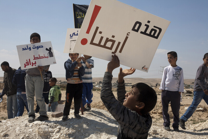 A boy displays a sign that reads “This is our land!” during a vigil to mark Land Day in the unrecognized Bedouin village of Wadi al-Naam in present-day Israel, 30 March 2012. Bedouins in the southern Naqab region have resisted decades of ongoing, forced displacement by Israeli authorities.