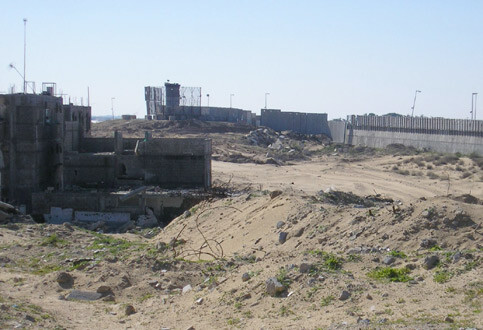A huge, 50-foot-high concrete wall separates the Gush Katif settlement bloc from Khan Yunis. Palestinian land between the Israeli settlement and Khan Yunis has been destroyed. (Arjan El Fassed)