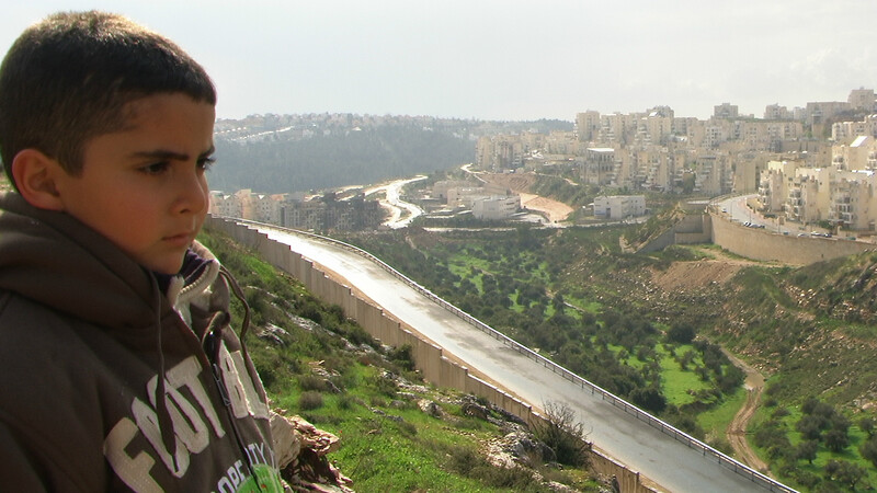 Jibreel, the filmmaker’s youngest son, looks towards Israeli settlements from Bilin.