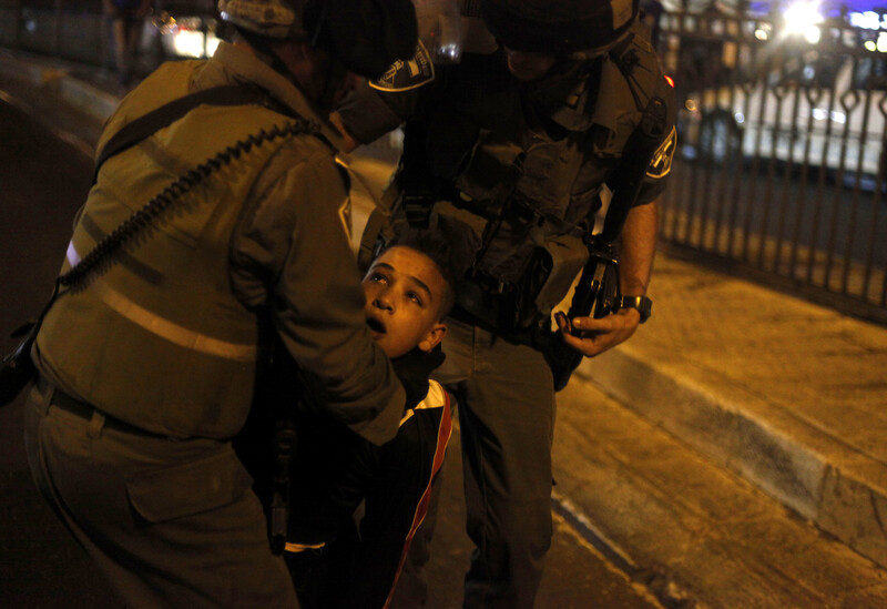 Israeli forces detain a Palestinian youth after an ultra-Orthodox Jewish man was stabbed and seriously wounded near Damascus Gate in the Old City of Jerusalem, 16 July.