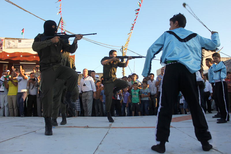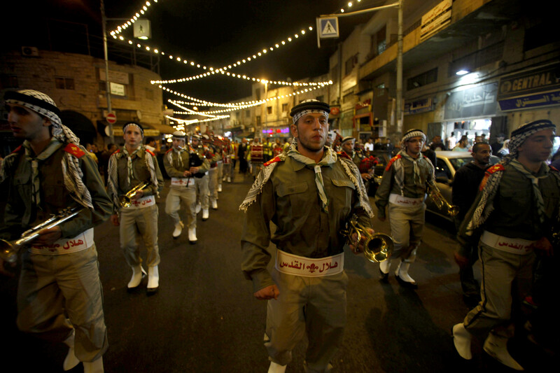 Palestinian scouts in Jerusalem perform during a rally supporting the city’s markets, 20 July. A group of Palestinians from Ramallah and Jerusalem, along with Palestinian citizens of Israel from Haifa, Nazareth, Jaffa and Acre are undertaking an awareness campaign to encourage Palestinians to buy from only Palestinian-owned shops during Ramadan.