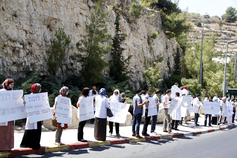 Palestinian students of medical colleges at Jerusalem’s al-Quds University protest in front of Hadassah medical center, demanding that the Israeli health ministry issue their certification to allow them to work in Israeli hospitals, Jerusalem, 31 July.