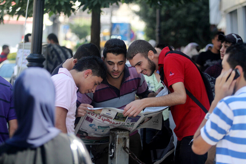 Palestinian students in Ramallah search for their scores in a local newspaper after announcement of the tawjihi high school final exam scores, which determine a student’s placement at university, 25 July.
