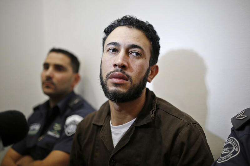 Wael Abu Rida sits next to Israeli prison guards before his indictment at the district court in the southern Israeli city of Beersheba, 19 July. The Gaza resident, secretly held by Israel after he vanished during a visit to Egypt the previous month, was indicted on terrorism charges, though Israeli authorities kept a lid on how and where he was detained.