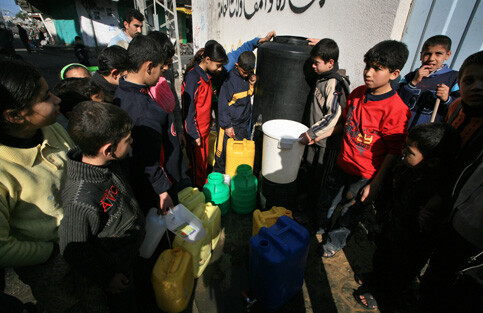 Palestinian children queue for drinking water in the al-Zeitoun neighborhood of Gaza City, 10 January 2009. (Wissam Nassar/MaanImages)