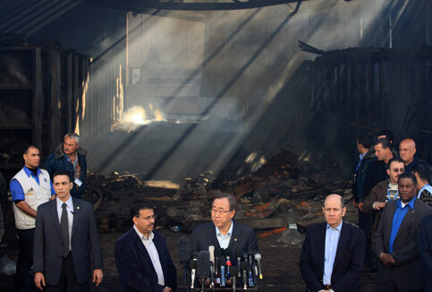 UN Secretary-General Ban Ki-moon at a press conference in Gaza City outside the UN headquarters, still smoldering from the Israeli bombardment of the facility, 20 January 2009. (Wissam Nassar/MaanImages)