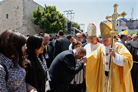 Pope Benedict XVI greets worshippers as he arrives at the Nativity Church in the West Bank city of Bethlehem, 13 May. (Mustafa Abu Dayeh/MaanImages)