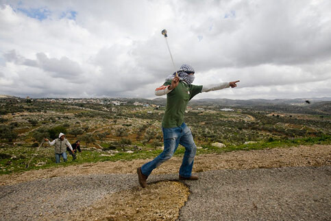 A Palestinian youth hurls a stone during a protest against the wall in Bilin, February 2009. (Oren Ziv/ActiveStills)