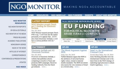 The Jerusalem-based organization poses as a project concerned with accountability for nongovernmental organizations (NGOs), but as Israeli human rights activist and journalist Didi Remez has stated, “NGO Monitor is not an objective watchdog: It is a partisan operation that suppresses its perceived ideological adversaries through the sophisticated use of McCarthyite techniques — blacklisting, guilt by association and selective filtering of facts” (“Bring on the transparency,” Haaretz, 26 November 2009).