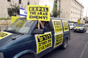 Above: Cars with an Israeli flag and placards in English and Hebrew reading “expel the Arab enemy” drive through the center of Jerusalem Sunday, March 17, 2002, while U.S. envoy Anthony Zinni continued his efforts to broker a cease-fire agreement between Israel and the Palestinians. (AP Photo/Peter Dejong)