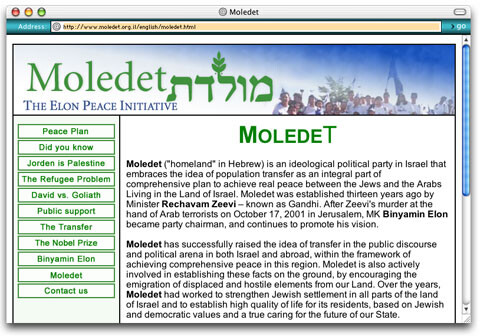 On its website, Moledet, led by Benny Elon, states that the party, whose name means “homeland,” is “an ideological political party in Israel that embraces the idea of population transfer as an integral part of comprehensive plan [sic] to achieve real peace between the Jews and the Arabs Living in the Land of Israel.”