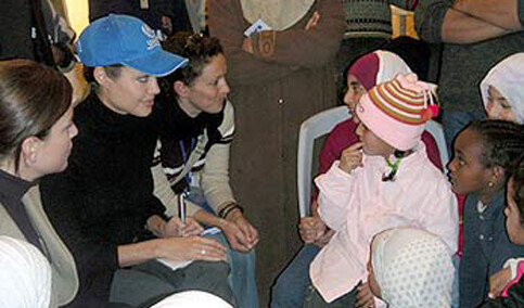 UNHCR Goodwill Ambassador Anglina Jolie visiting refugee children at a healthcare centre in Ruwaished camp, Jordan (Photo: UNHCR/B.Bronee, 2003)