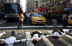 At a New York branch of Israel’s Bank Leumi, eighteen protesters locked together as a human barricade across Fifth Avenue on 27 March 2003. This is the protest related to the prosecutions.