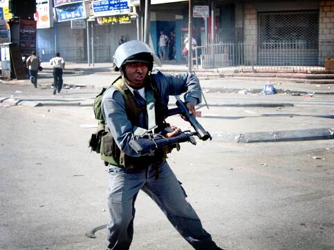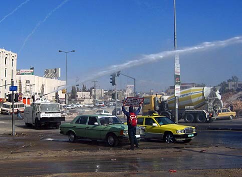 An orderly and peaceful protest march of thousands was broken into many small clusters, keeping loose communications via mobile phones. Some found refuge and welxome in Palestinian homes and offices; others were pursued deeper into the streets of Al-Ram. Uri Avnery had managed to get into a shop near the junction where the police violence started. From there, the experienced journalist-activist opened a direct line to the media: “This looks like a real battlefield; every ten minutes or so, the youngsters are emerging from one of the alleys. They throw stones, also that they are too far from the Border Police to hit, and the police open up again very heavily. I have myself enough onion for the whiffs which I get here… Just now they shot a cannister directly at an ambulance crew which was picking up one of the wounded.”
