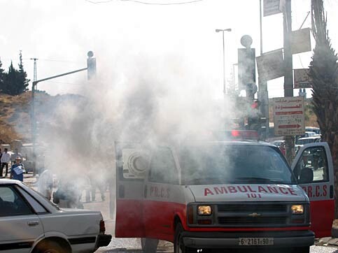 Teargas clouds a Palestinian ambulance. (Rima Merriman)