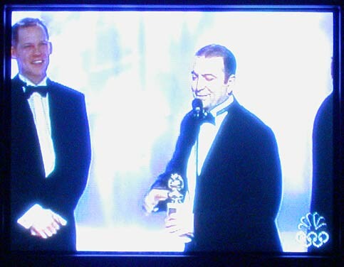 Director Hany Abu-Assad shakes hands with the presenters as he collects his award. (EI)