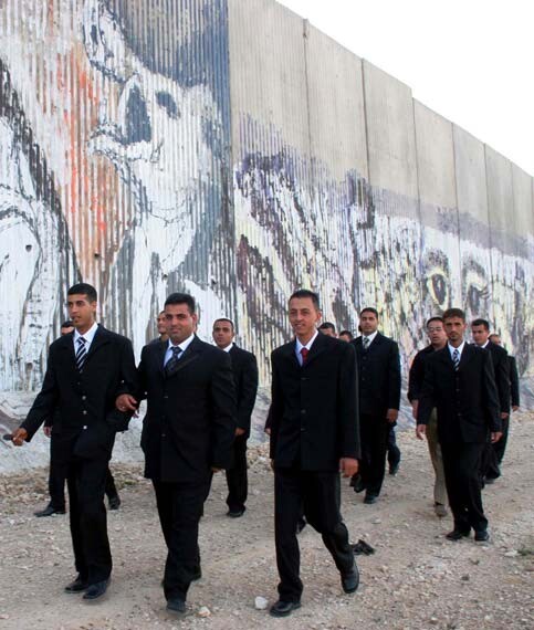 Palestinian bridegrooms visit the separation wall before their wedding ceremony in the West Bank city of Qalqilia September 16, 2005. (MaanImages/Khaleel Reash)