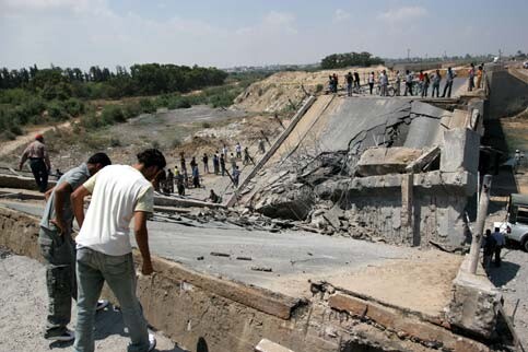 Palestinians inspecting a bridge destroyed by Israeli army warplanes on a main road in the northern Gaza Strip, June 28, 2006. (MaanImages/Wesam Saleh)