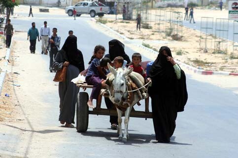 A Palestinian family evacuating their home after Israeli attacks on the Gaza Strip demolished bridges and a power station, June 28, 2006. (MaanImages/Hatem Omar)