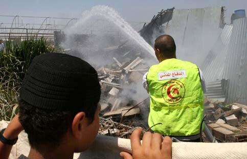 A Palestinian fireman fights a fire at a metal foundry in Rafah Refugee Camp in the southern Gaza Strip, June 28, 2006. (MaanImages/Hatem Omar)