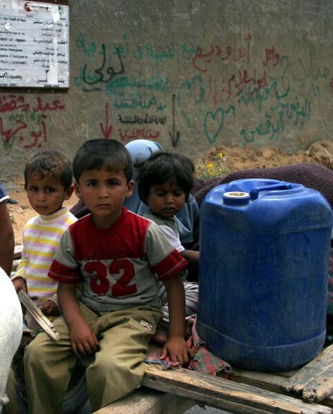 A Palestinian family that evacuated their home after Israel attacked the Gaza Strip, demolishing bridges and a power station, June 28, 2006. (MaanImages/Hatem Omar)
