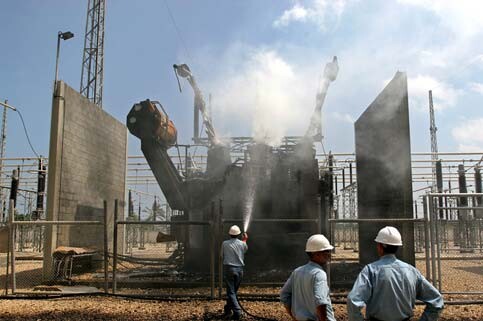 Palestinian electricity workers extinguish a fire inside the headquarters of the main electricity company in the Gaza Strip after it was attacked by an Israeli missile during air strikes over the city, June 28, 2006. (MaanImages/Wesam Saleh)