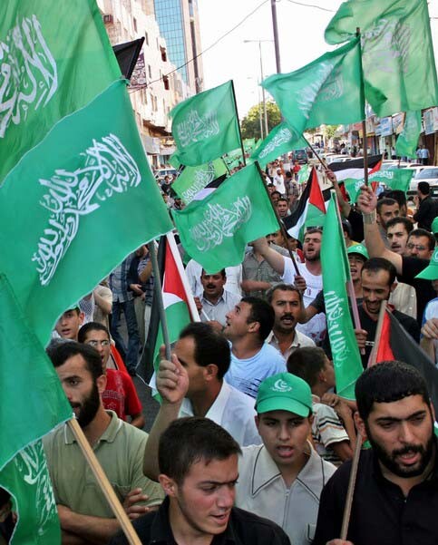 Hamas supporters demonstrate during a protest against the arrest of Palestinian ministers and lawmakers by Israeli troops in Hebron, June 29, 2006. (MaanImages/Mahmoun Wazwaz)