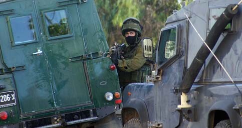 Israeli soldiers taking positions during an invasion to arrest Palestinians in the West Bank city of Ramallah, June 28, 2006. Ramallah is where the illegal settler taken prisoner in response to the Gaza raid is believed to be held. (MaanImages/Fadi Arouri)