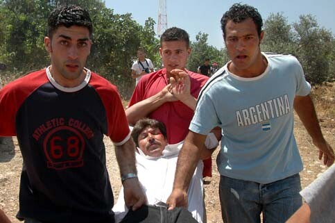 Youths carry a Palestinian man wounded by Israeli soldiers during a demonstration against the controversial separation wall in the West Bank village of Bilin west of Ramallah June 30, 2006. (MaanImages/Mushir Abdelrahman)