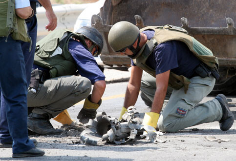 Israeli policemen remove pieces of a Katyusha Rocket that hit a road in the northern town of Nahariya, near the Israeli/Lebanese border 13 July 2006. (MaanImages/Magnus Johansson)
