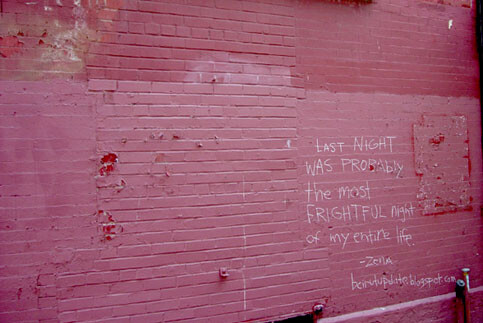 Lauren Macdonald took excerpts from Zena’s email and wrote them all over Chelsea, for example, “Last night was probably the most frightful night of my entire life - Zena”, and then she wrote the blogspot address.